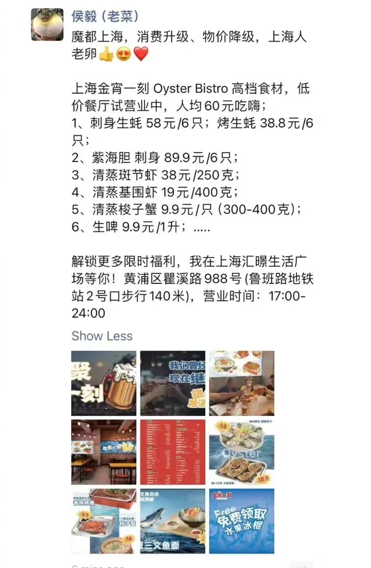 在明面上,这家公司与侯毅个人无直接股权或公开职务联系,不过,侯毅本人向壹览商业确认这是其新推动的项目,亦在其朋友圈进行了宣传。从现场情况看,该店位于写字楼一层,为独立门店,可容纳约百人,室内、室外均设置有座位。壹览商业从菜单中看到,产品价格在6-129元不等。根据大众点评的评论和菜品价格,人均消费在60元左右。(壹览商业)