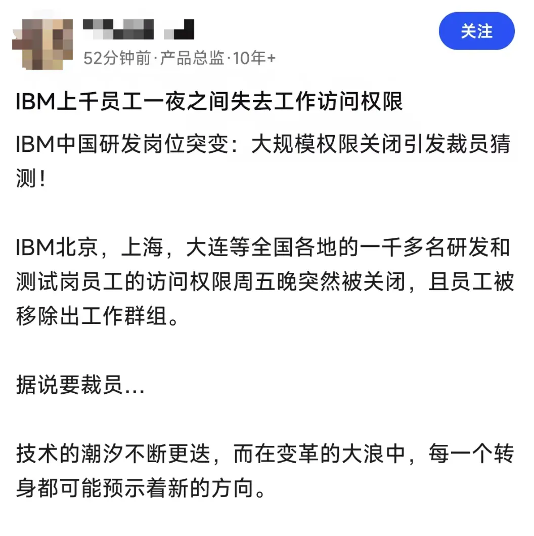 1.IBM中国研发岗访问权限一夜关闭,千人或被裁,或有新一轮人事调整