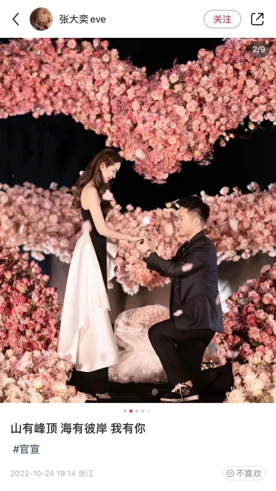 10月24日晚间,如涵控股联合创始人、网红博主张大奕官宣订婚。她在社交平台上发布了一组求婚现场的照片,并配文道:" 山有峰顶,海有彼岸,我有你。" 从照片来看,其未婚夫与张大奕年龄相仿。二人在巨大的心形玫瑰前面,男方单膝下跪为她戴上戒指。