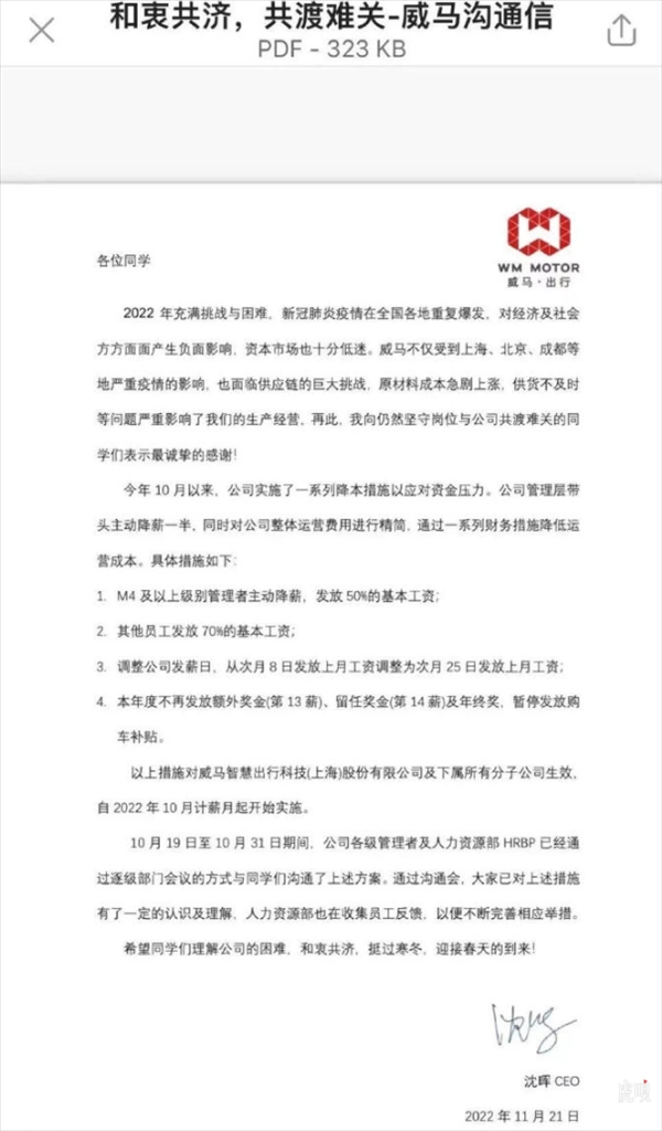 威马CEO内部信曝光:全员工资打五到七折,取消年终奖等奖金