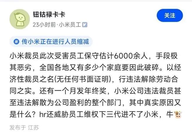 该员工爆料此次裁员预计人数在6000人左右,同时补偿金额也不尽如人意,目前在网上关于小米裁员的消息也是纷至沓来。此外本次裁员除了小米正式员工之外,也包括大量的应届生,也有应届生称处于试用期时就被小米公司裁员,可以说这次的裁员或许是小米公司最大的一次裁员潮,而小米官方目前没有针对大规模裁员作出回应。