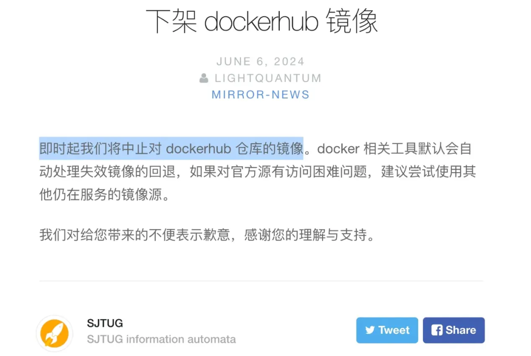 众所周知,由于一些原因,Docker 官方源在国内的连接速度非常慢,甚至无法正常下载。因此,国内用户通常依赖于国内镜像源,如网易、中科大、阿里等。但最近,部分用户遇到了无法拉取 Docker 镜像的问题,即使换了国内源也会拉取失败。这一切发生得悄无声息,直到上交大的中文主页门户网站发布了相关信息。