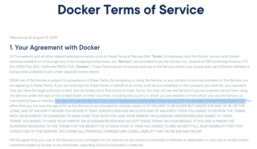 根据 Docker 的服务条款 20.8 节,该服务受到美国商务部和美国财政部海外资产控制办公室的出口管制。这意味着,任何希望使用 Docker 服务的个人或组织,都必须声明自己不在禁运国家,也不属于任何被美国政府特别指定的实体。