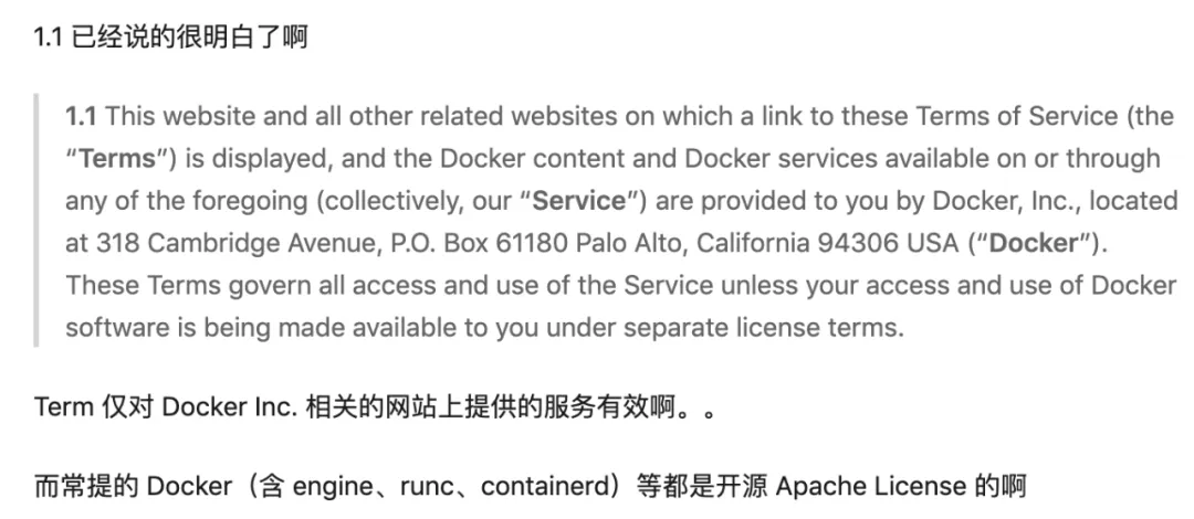 不过,许多网友在知乎等平台上展开了热烈的讨论,指出 Docker 更新的服务协议主要针对的是 Docker Inc. 提供的服务,而开源的 Docker(包括 engine、runc 和 containerd)依然遵循 Apache License,理论上不受影响。
