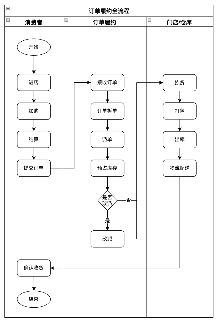 订单履约过程是一系列精细协作的流程,从客户在销售平台下单开始,至商品交付用户手中结束。此过程跨越多个环节,包括消费者在销售平台下单、订单履约系统接收订单、预占库存,以及仓库和门店执行拣货、发货处理等环节。每一步都必须无缝衔接,确保整个流程高效运转。业务流程的关键在于各系统间的信息流顺畅传递,任何环节的延误都可能影响整体履约时效,进而影响客户满意度和对企业的信任。