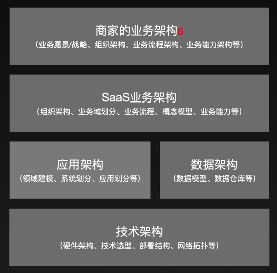 企业级SaaS系统的视图可分为:商家业务架构,SaaS业务架构,应用架构,数据架构,技术架构。其中业务架构是灵魂,应用架构,数据架构,技术架构都是支撑业务架构而存在的,这三者也统称IT架构。