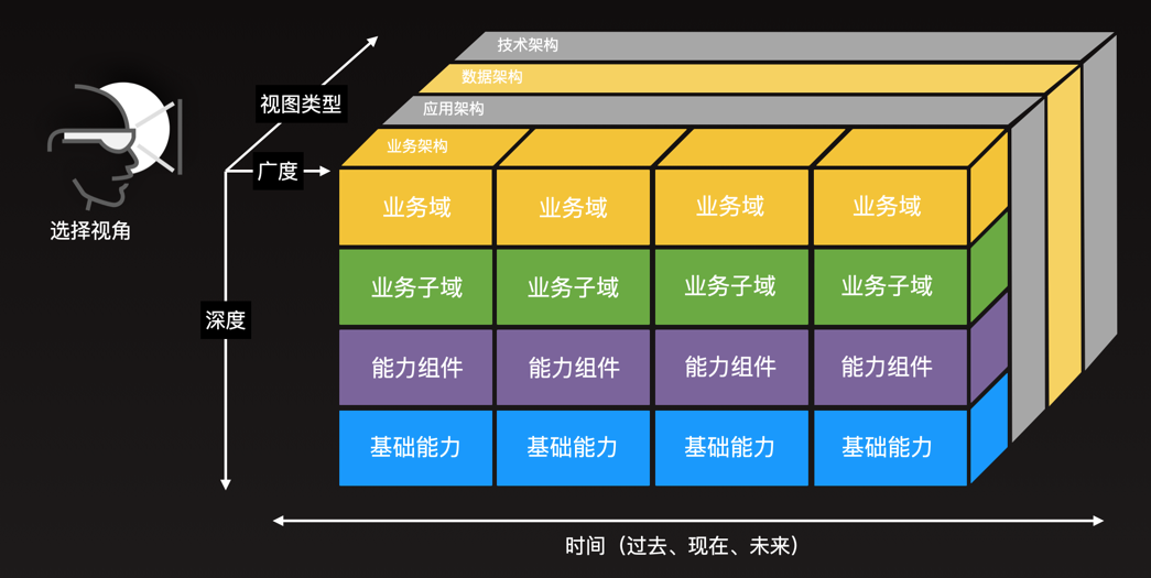 如果把视角比作一个坐标点,那它需要一套坐标系,坐标系通常有4个维度:广度、深度、视图类型、时间。