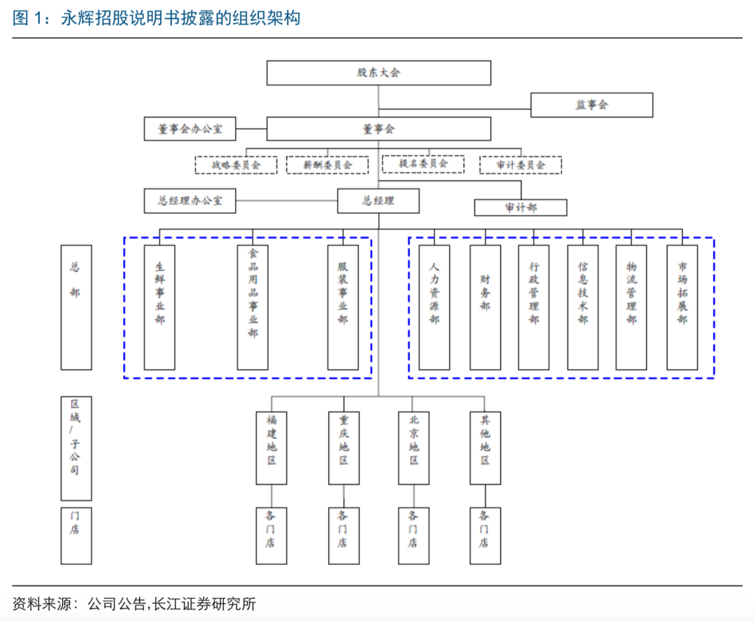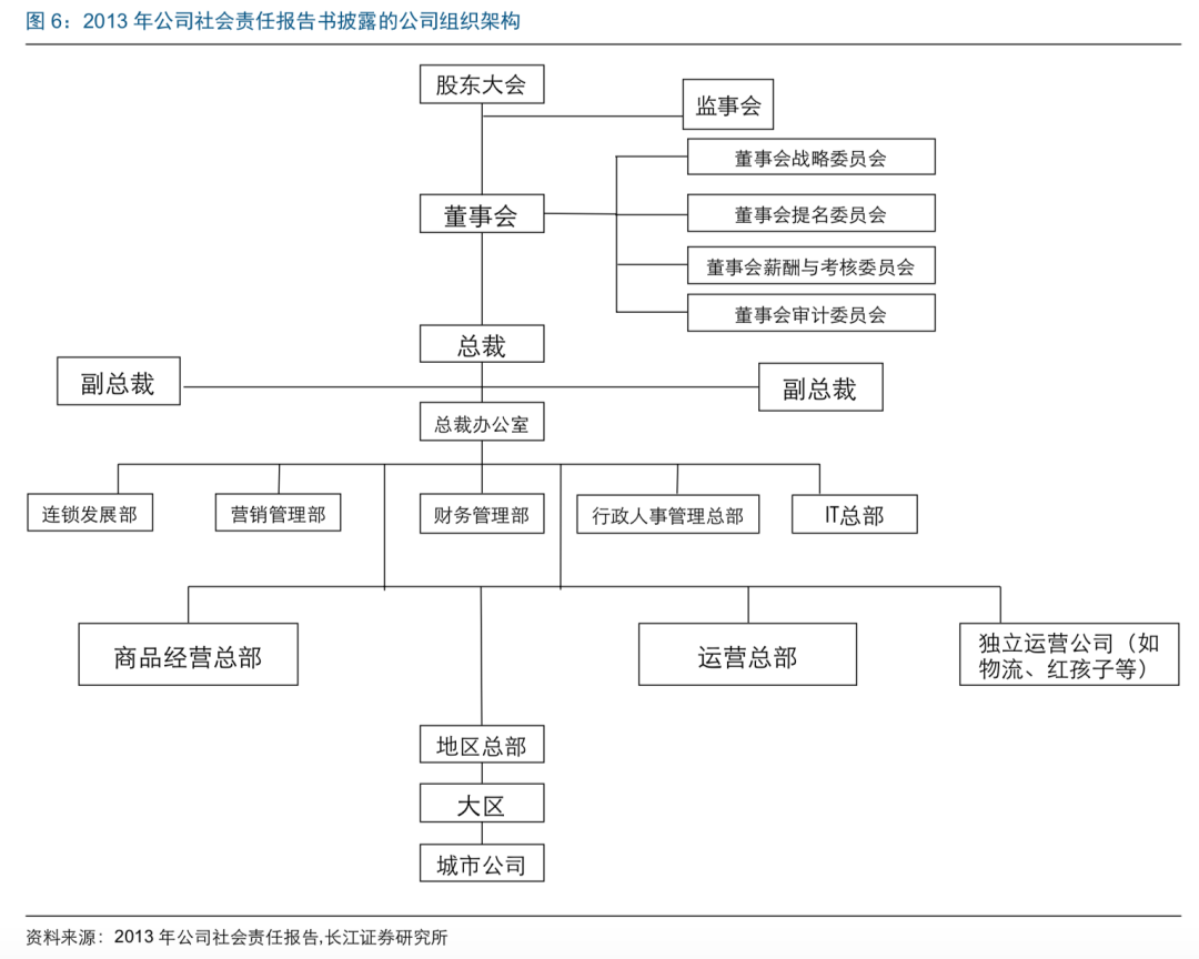下面列举了永辉2010招股书、苏宁易购2013披露的组织架构。永辉2010招股书披露的组织架构