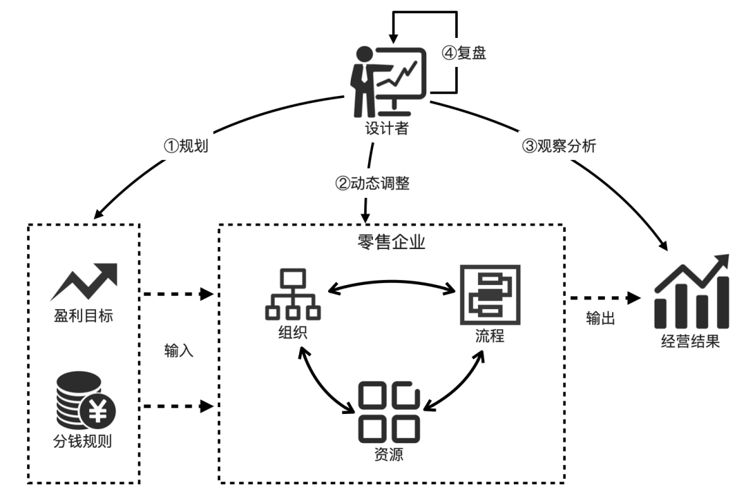 机器运转的过程可以抽象为,决策层给机器一个输入(盈利目标、分钱规则),过一段时间(通常是按财务核算周期划分),机器产出经营结果(各类经营数据、收入、成本、利润等财务数据)。