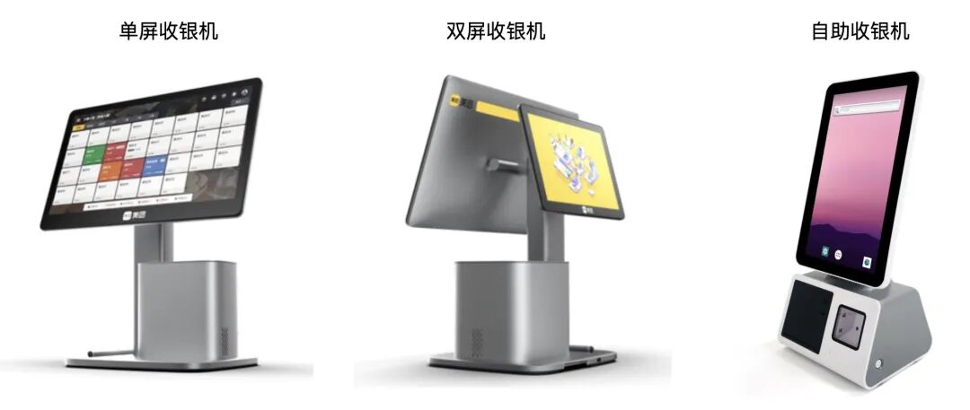 按设备类型分类,有单屏收银机、双屏收银机、自助收银机。