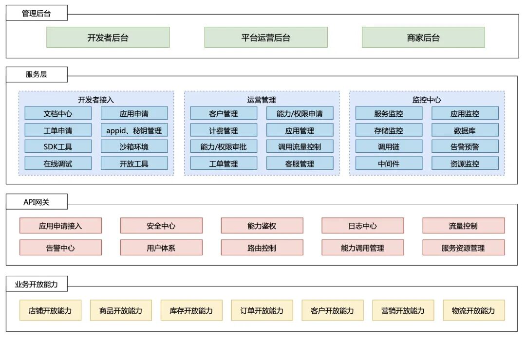 • 开发者接入:提供API文档、SDK工具、开发指南,应用的注册、管理等。