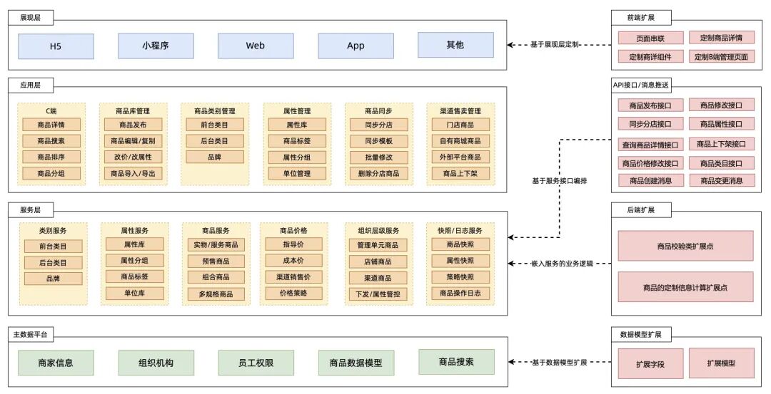 • 后端扩展:商品校验类扩展点(例如,商品创建时,校验商品编码是否符合定制需求的规范)、商品的定制信息计算扩展点(例如,通过外部接口计算出商品重量信息)。