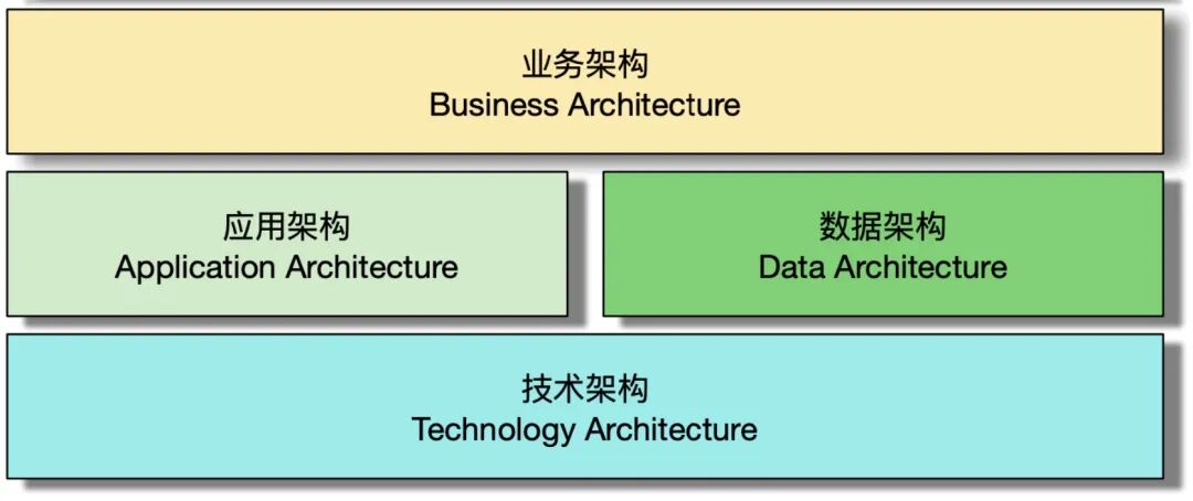 其中业务架构是灵魂,应用架构,数据架构,技术架构都是支撑业务架构而存在的,后三者也统称IT架构。
