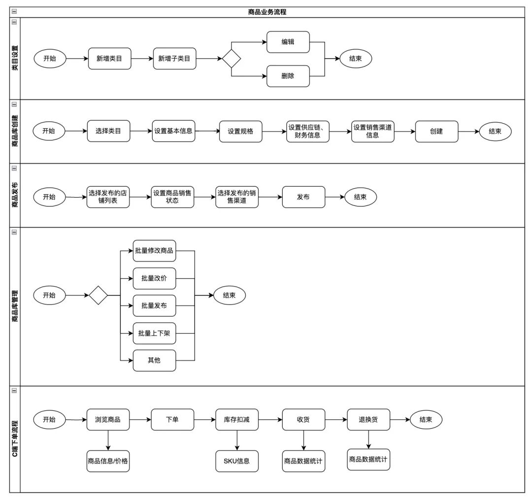 从业务全流程来看,商品系统需要提供强大的功能,来支撑采购、配送、销售、履约、售后、退仓、财务核算、结算、数据分析等各个业务环节。