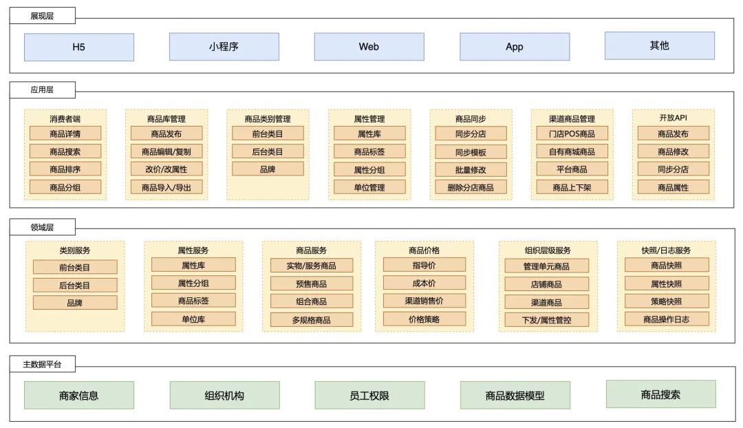 对于零售业务来说,商品系统几乎需要支撑所有业务系统,从商品采购、到仓库收货、上架、前台展示、下单、配送、用户收货、到售后服务等环节,都离不开商品系统。