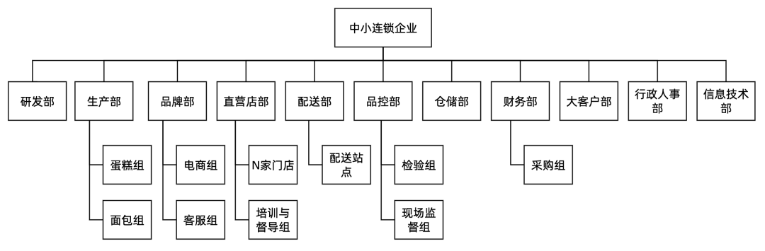 中小连锁企业下设部门通常包括:研发部、生产部、品牌部、直营店部、配送部、品控部、仓储部、采购部、大客户部、行政人事部、信息技术部。