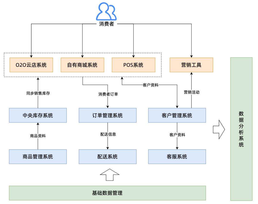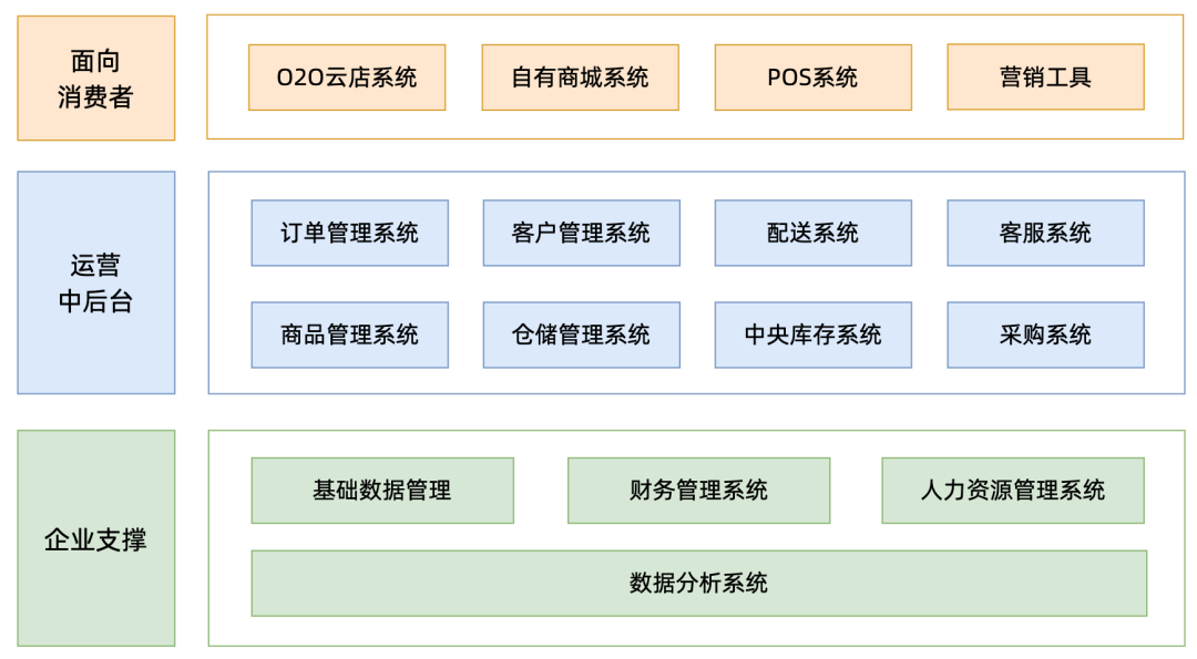 面向消费者的销售管理系统:O2O云店系统、自有商城系统、POS系统、订单管理系统、配送系统。