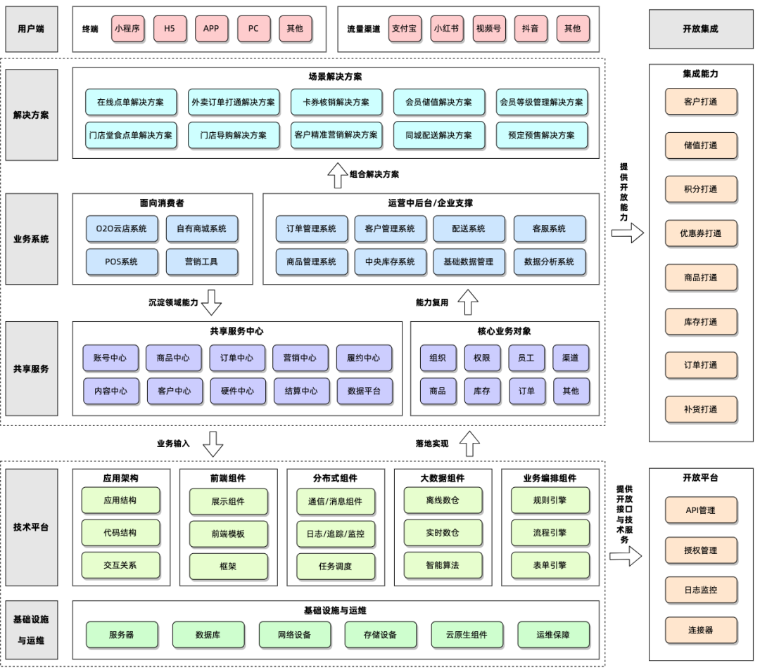 业务系统:提供各个业务领域的核心系统,包括O2O云店系统、自有商城系统、POS系统、订单管理系统、配送系统等。