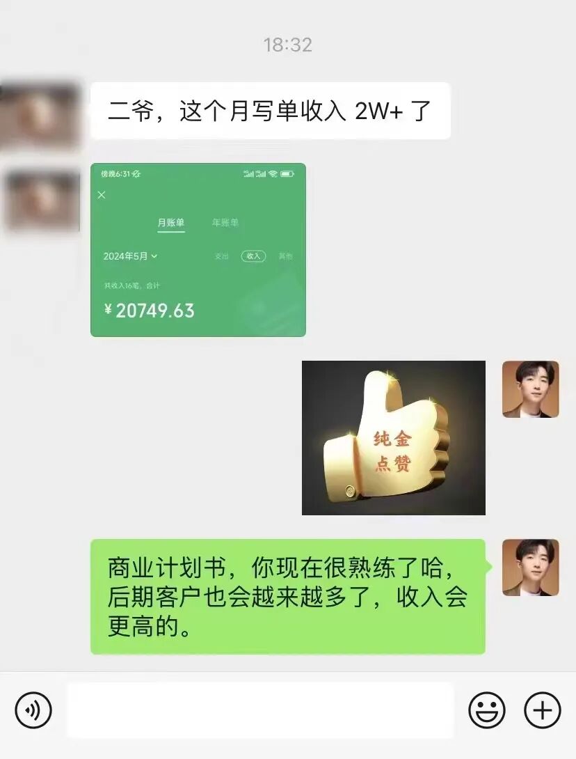 后面他基本就是每月帮客户撰写商业计划书,一单大概就是 1000 -2000 元左右,借助 KIMI 这类型的大模型工具,基本就是一天时间完成。