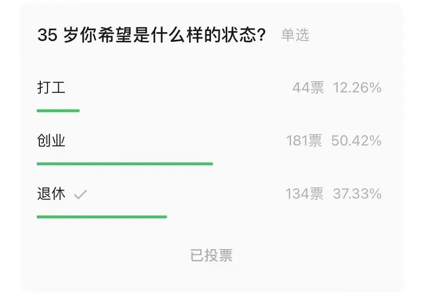 昨天我做了问卷投票,询问大家 35 岁希望是什么状态,这个结果是没有想到的,有一半人希望在 35 岁创业,并不是退休。