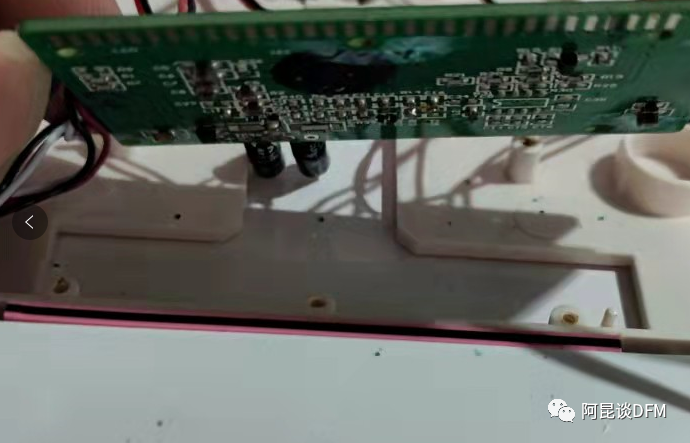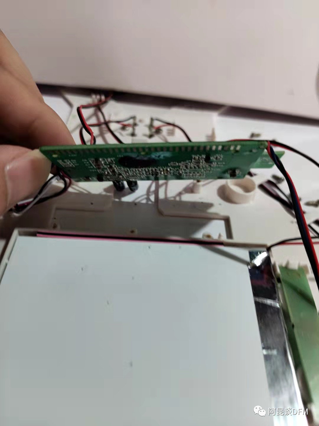 拆了五个螺丝把电路板取下来,才发现液晶屏是通过导电胶条和电路板上金手指连接,怪不得这么小个电路板上要用5个螺丝固定,而且还有定位柱,原来就是为了考虑这个液晶屏的连接,导电胶条液晶的连接要求其实算是高的,搞不好就容易出现亮线。所以固定必需满足2个条件,一是对准。二是压紧。