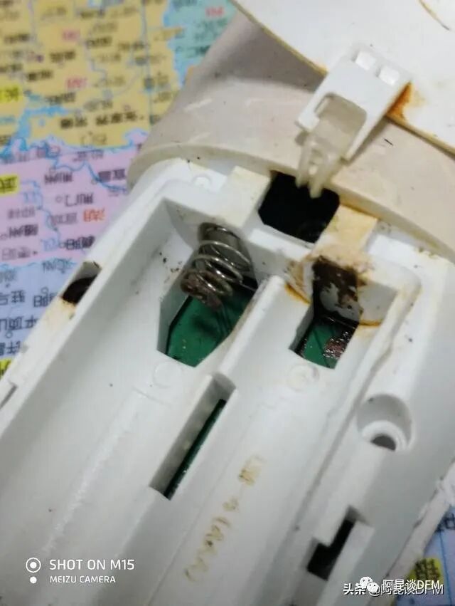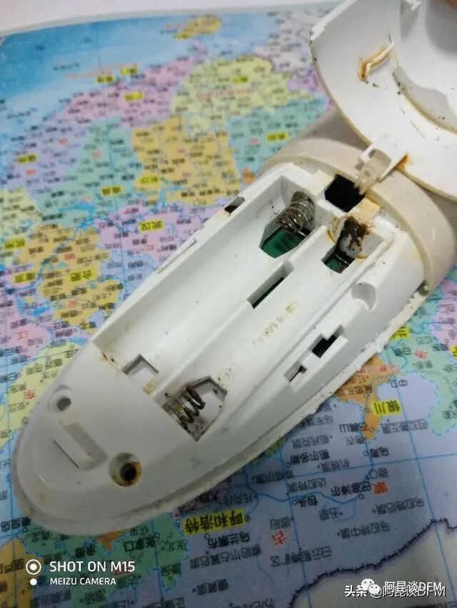 几个月后问题来了,妈妈反馈电池没多久就没电,买了一堆便宜的新电池,不知道是否是电池有问题,没用多久就漏液,,把金属弹簧给腐蚀不成样了,没办法,拆开来看下能不能改装一下,让电池好接触或直接改成充电的,改装前,先拆开看一下内部PCB和装配设计吧,学习一下。