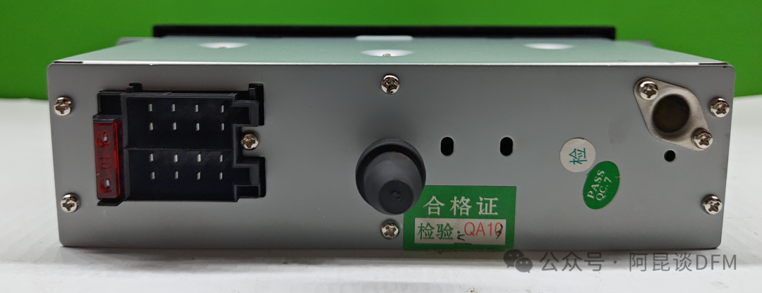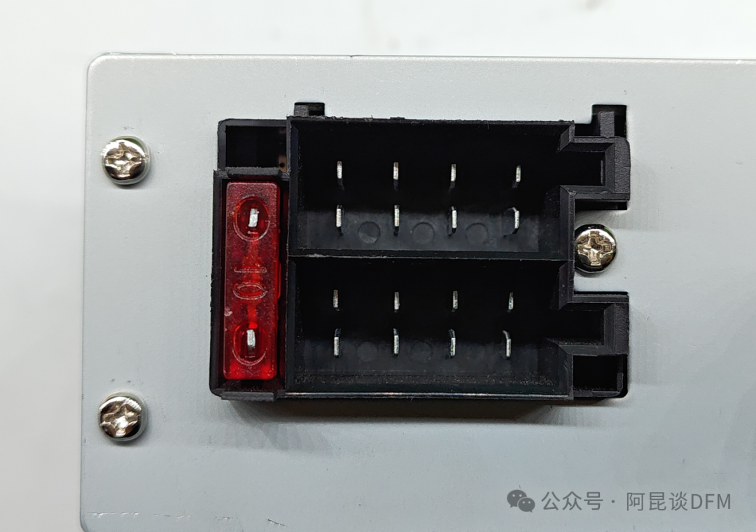 背后从左到右是车载线束插座,用于连接汽车上的电源、喇叭音箱等。其中红色的部分是一个保险丝。中间这根戴帽的黑色螺杆不知道是做什么的,可能是用于车内安装固定。