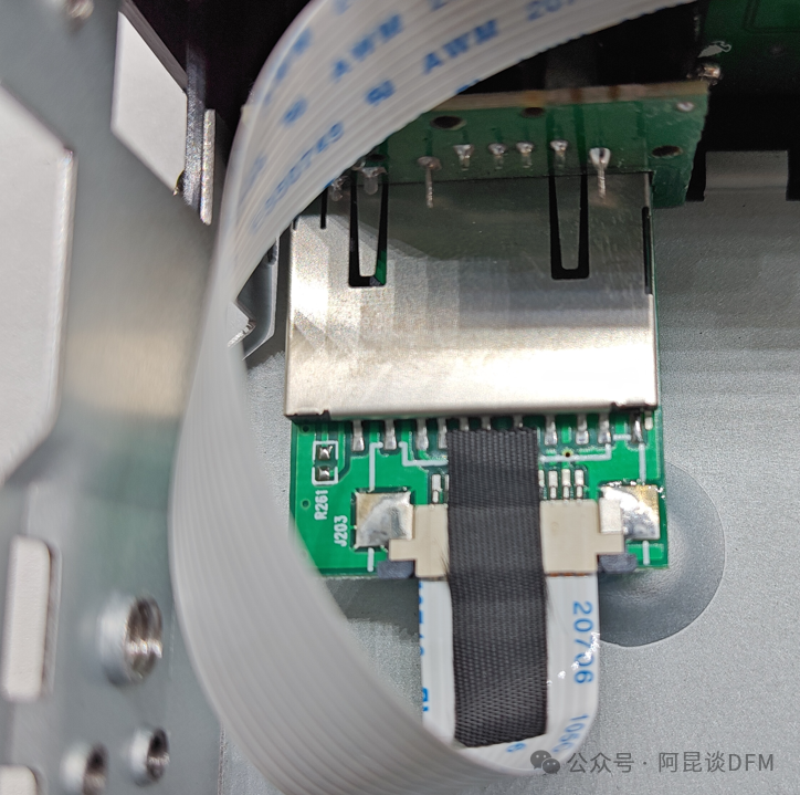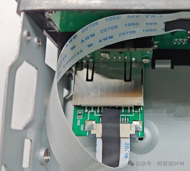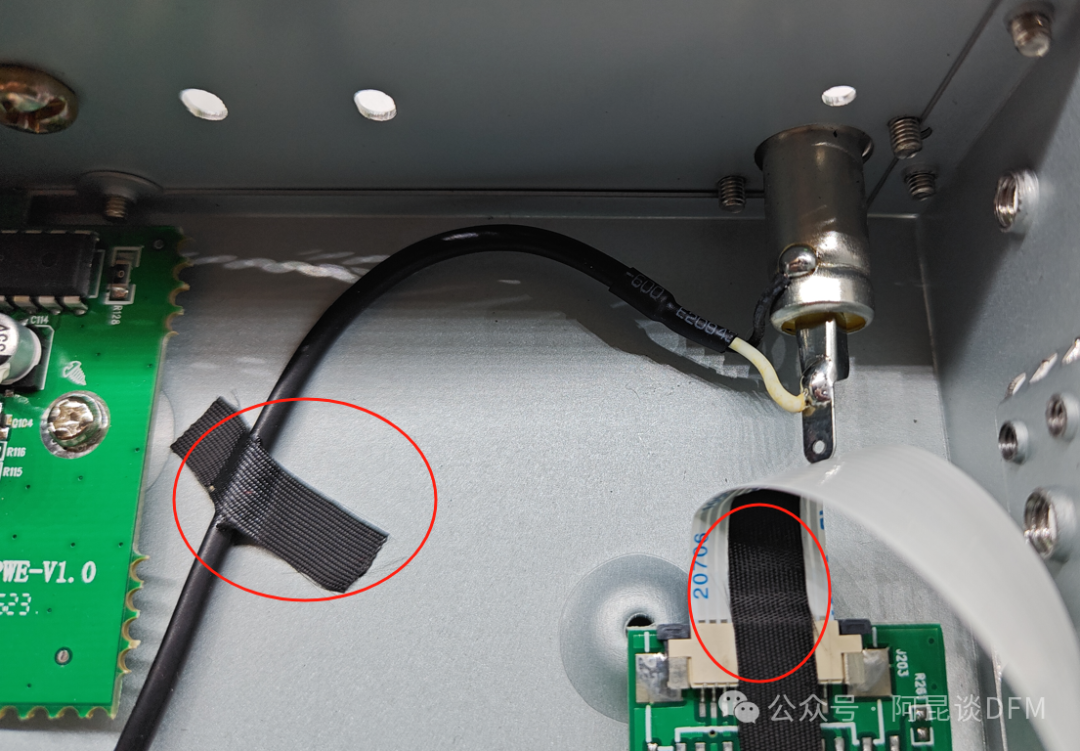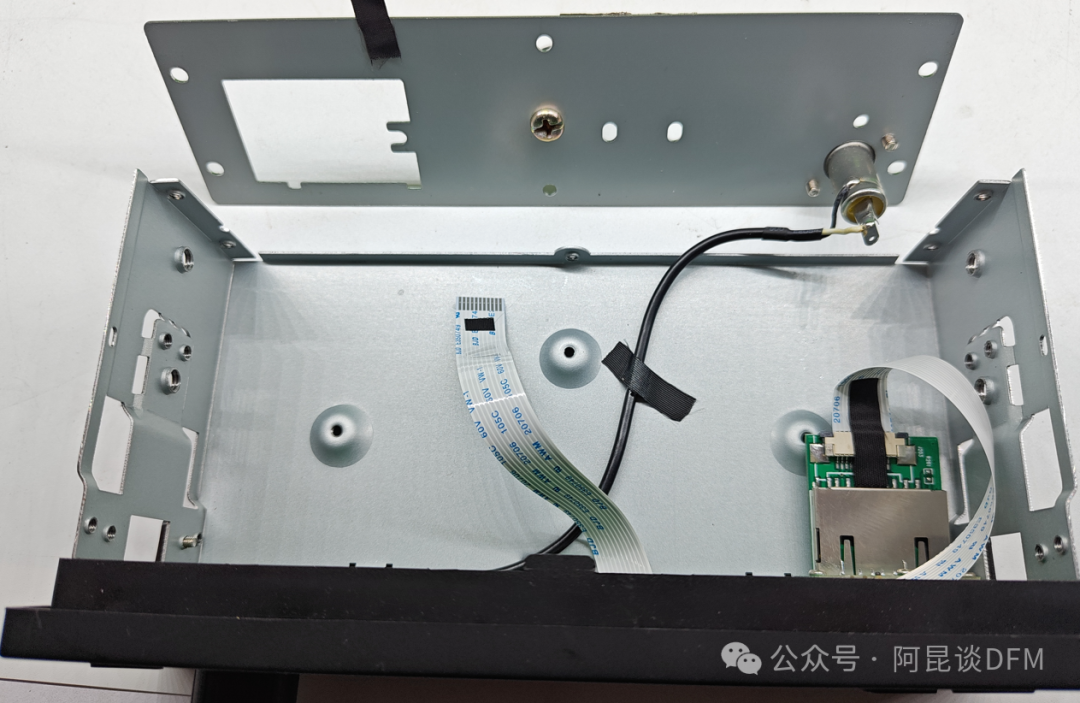 可以看到每个FFC连线处,包括收音机天线走线部分都用胶布进行固定,以确保连接的可靠稳定,这种小细节也说明了汽车产品的可靠性。