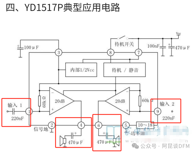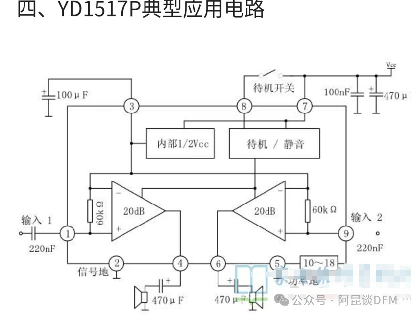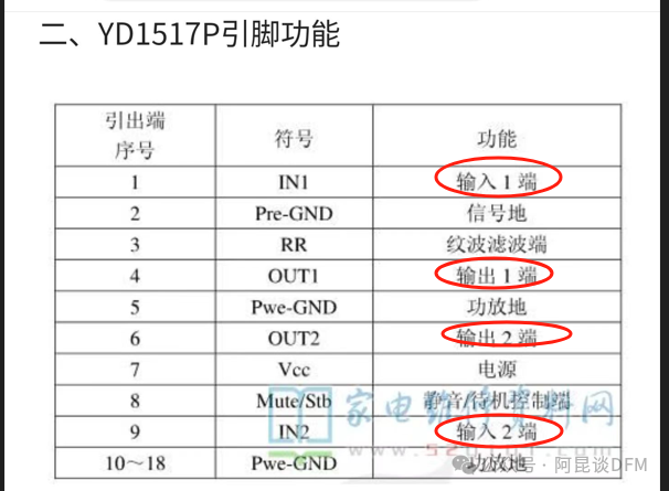 这是功放部分电路芯片,芯片型号为YD1517P,我们看下规格书