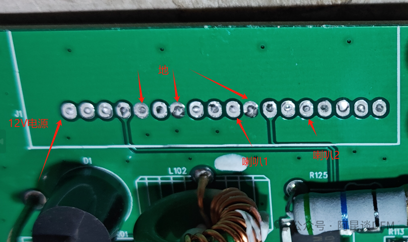 下面怎么把这个功放改成方便自已家用的接线呢,首先我们要找到这个功放的电源、地、喇叭输出。