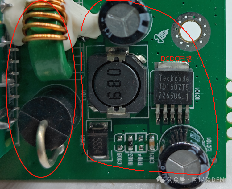 2个大的二极管和绕线线圈主主要是起保护作用、小二极管、贴片电感、输入输出电容和一个TD1507T5芯片构成一个DCDC电源电路,从汽车电瓶进来的12V电源通过它转换成5V或3.3V电源给到后面的芯片供电。
