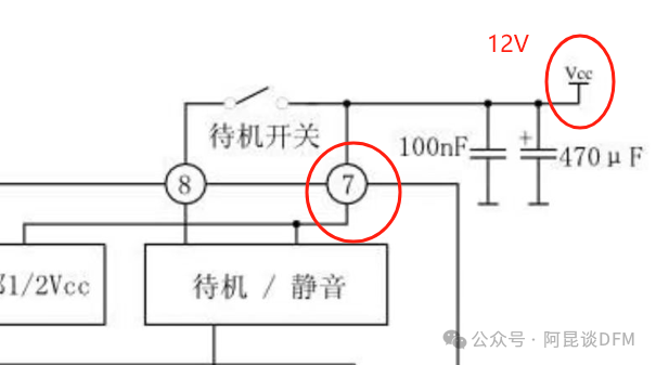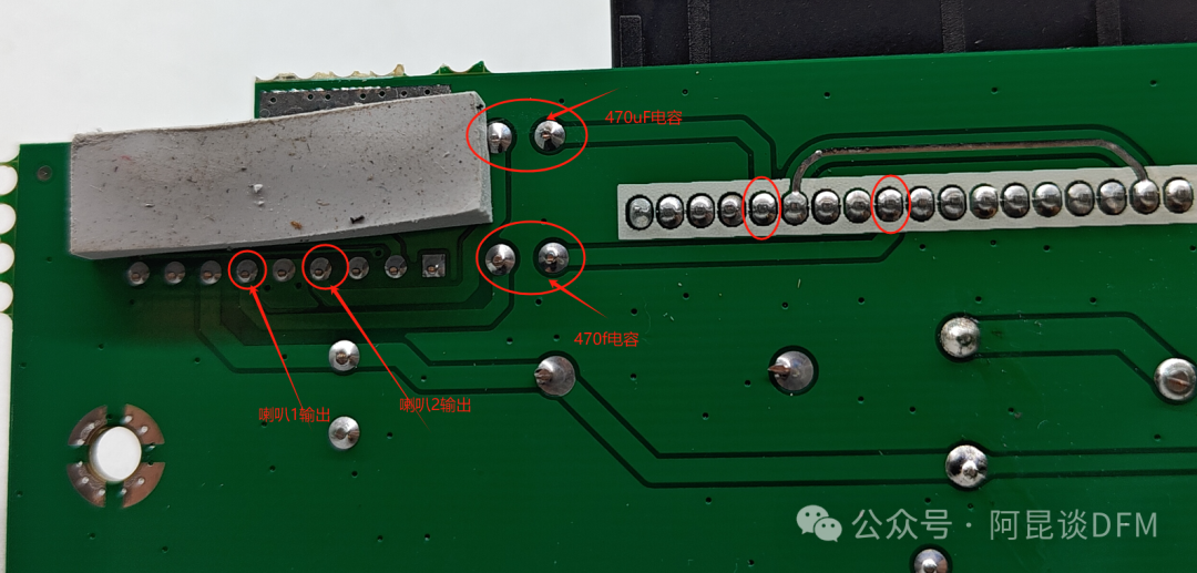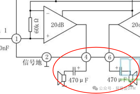 功放输出脚是串了一个470uF电容连接喇叭1和喇叭2到地。
