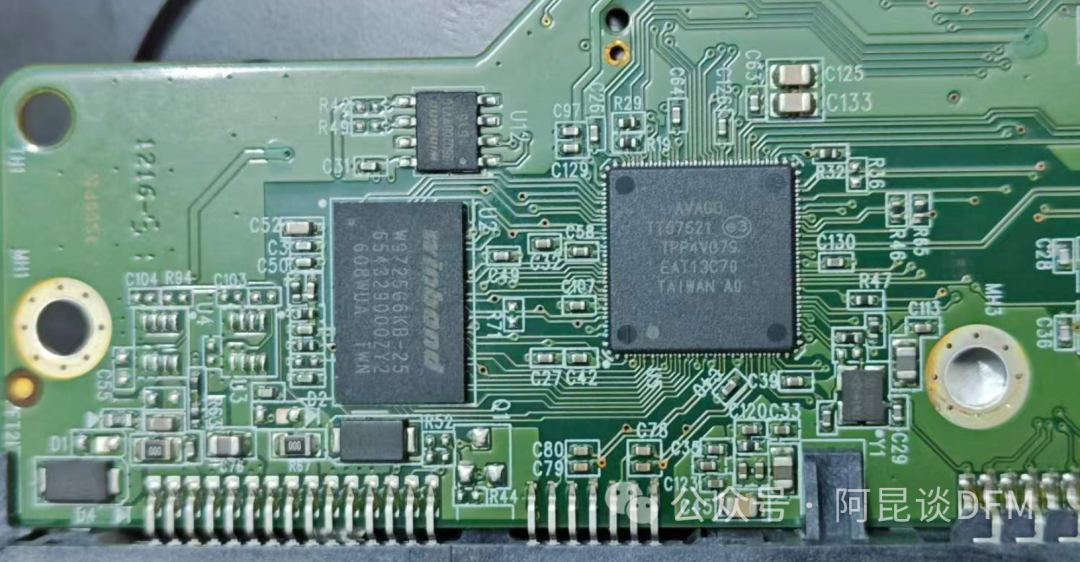 不知道为啥,硬盘电路板的走线一直给我感觉像业余选手画的,不是说这块硬盘,而是发现很多硬盘的电路板走线不美观,不知道大家有没有同样感觉,当然这只是个人主观感觉。