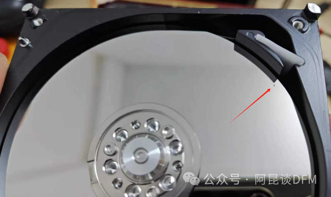 仔细看了一下硬盘,好像就看到一个小异物,应该不是拆盖的时候带进来的吧,因为拆开来没十多秒我就发现了。(不敢完全肯定)