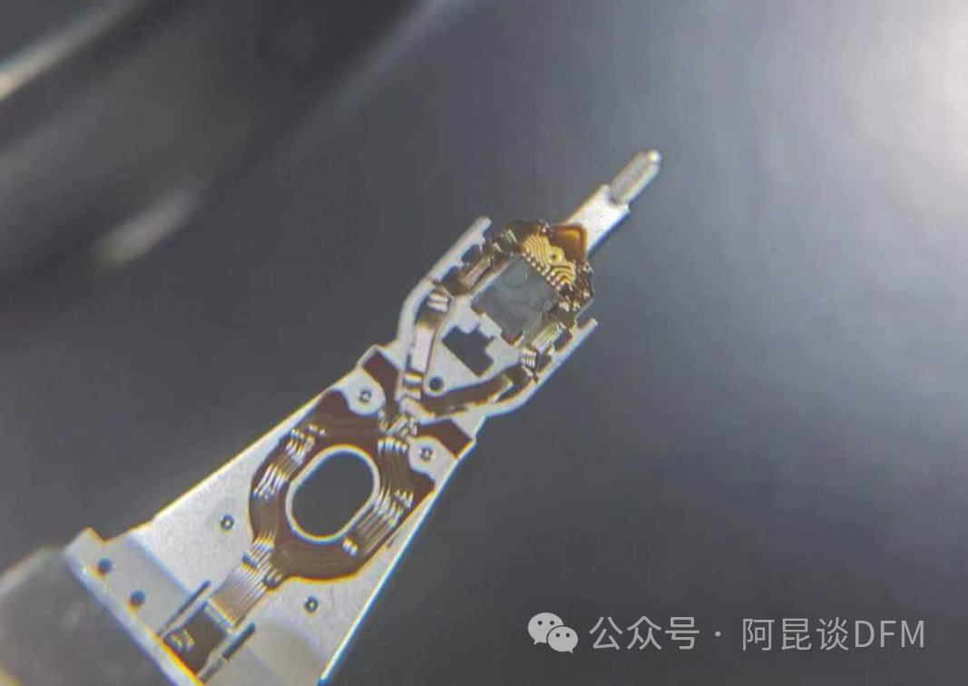 这磁头不得不说真是精密的零件啊,用放大镜看才发现在最尖端部分,除了有FPC软线,还有芯片焊接在上面,有点近视的人用肉眼难看清。