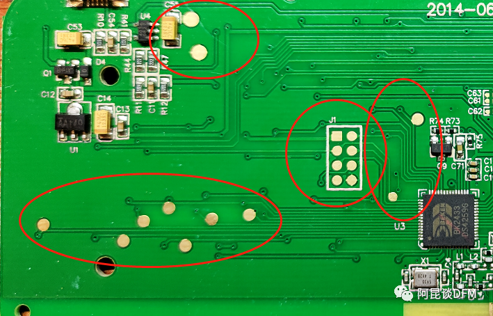 这是PCB背面,特别简洁。中间向上位置可以看出这是一款2014-6-16号设计的PCB,PCB生产日期不详未印。