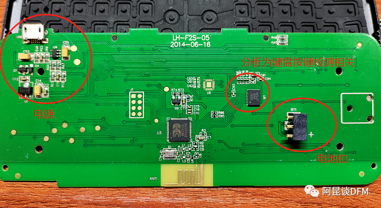 这个就是用来里面芯片程序升级用的!从可生产性角度来说,这个设计是巧妙的,因为当产品组装完成后,发现程序需要优化升级,这时不需把机壳全拆开,不然成本太大了,只要打开后盖,可以直接使用工装接触测试点进行程序烧录。