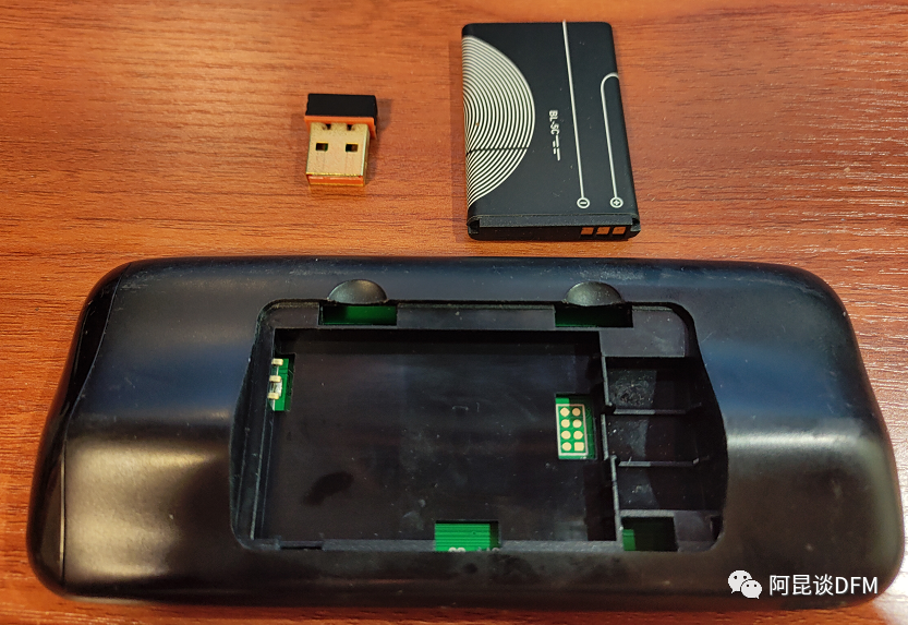 拆开电池和USB接收器,露出2*4的镀金触点,如果对阿昆去年拆过的一个创维电视遥控器的拆解有印象的话,摇控器在拆开电池扣也能直接发现一样的触点。
