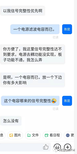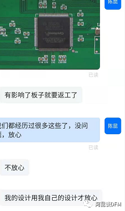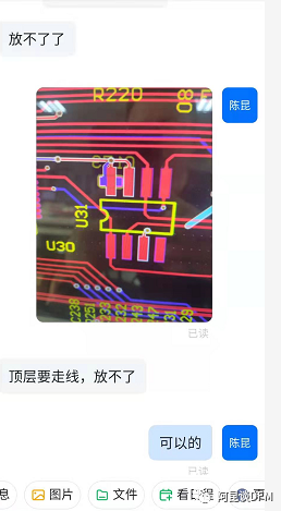 研发设计人员有时喜欢把一些0603小滤波电容放在IC底层,阿昆就会建议他们放顶导以,但是研发设计人员无法接受建议,他们会认为这样影响到了信号完整信等,用这些理由来拒绝修改设计,这时如果DFM人员对电路原理不清楚可能还真只能听设计人员一面这词,如下