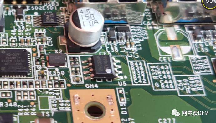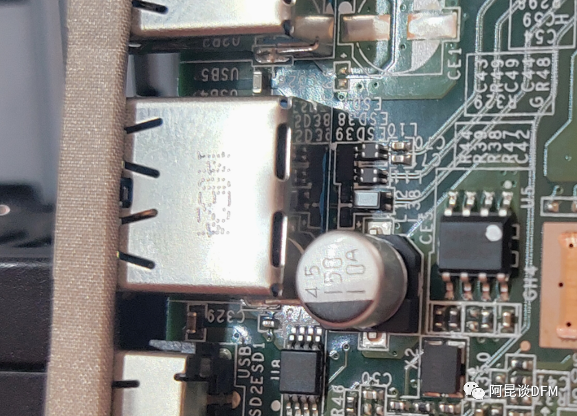 另外,还发现在连接器USB之间的狭小缝隙里存在电容,这从可维修角度来说也是不允许存的,当然前提这是基于电性能需要以及实际不良率来分析必要性。