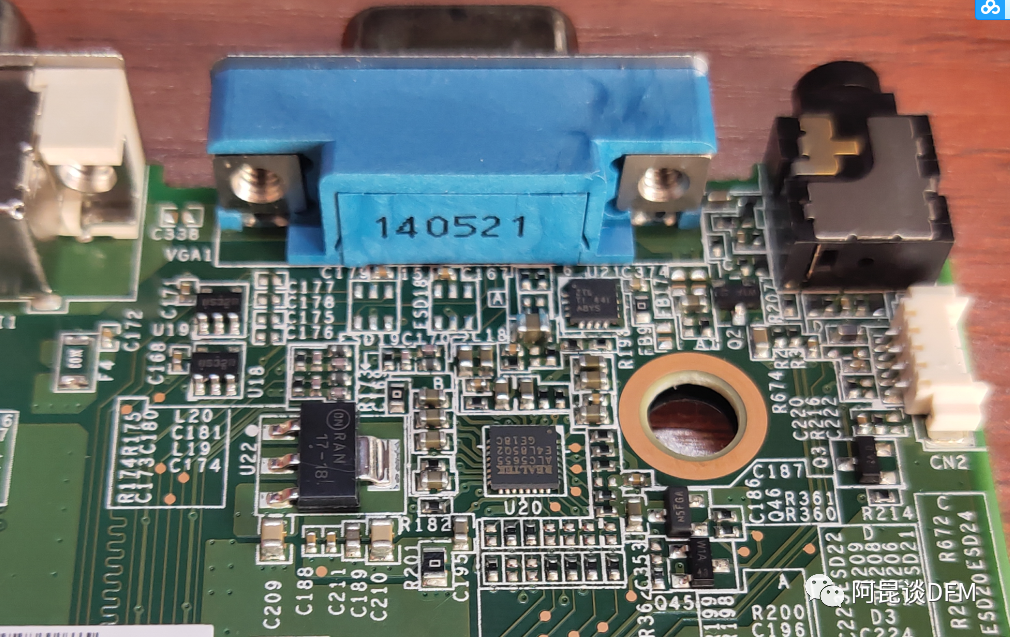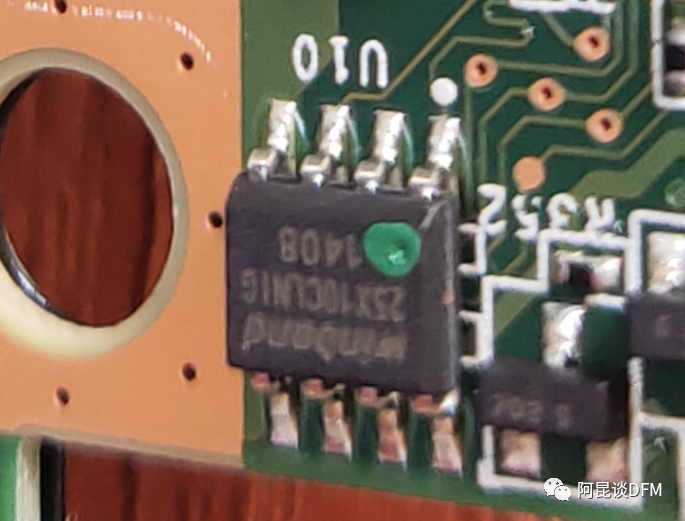 我们还发现了2个芯片上有标识点,这个是什么呢,还真巧,前几个月阿昆刚好处理过类似情况,这种芯片是需要烧录程序,工厂是先将芯片外发专业烧录芯片的工厂进行自动化烧录,完成烧录后,为了便于区分和跟踪,工厂在芯片上作不同颜色的标记。对于量大的产品涉及到IC程序烧录 ,给到专业代烧工厂烧录代替人工是不二选择,不管质量、成本都有保证。