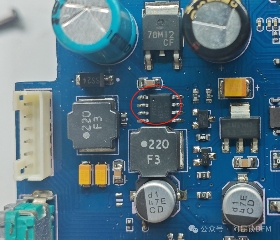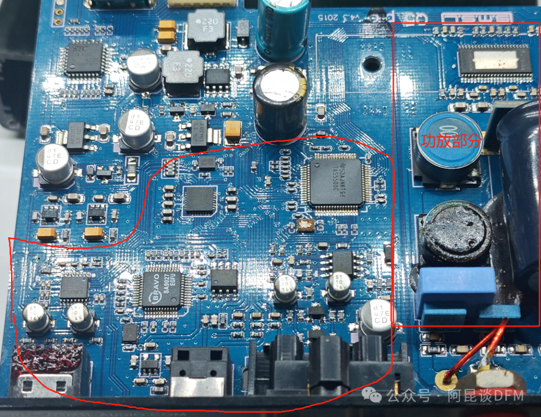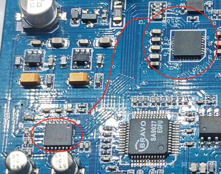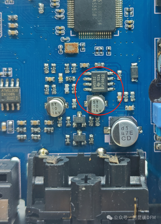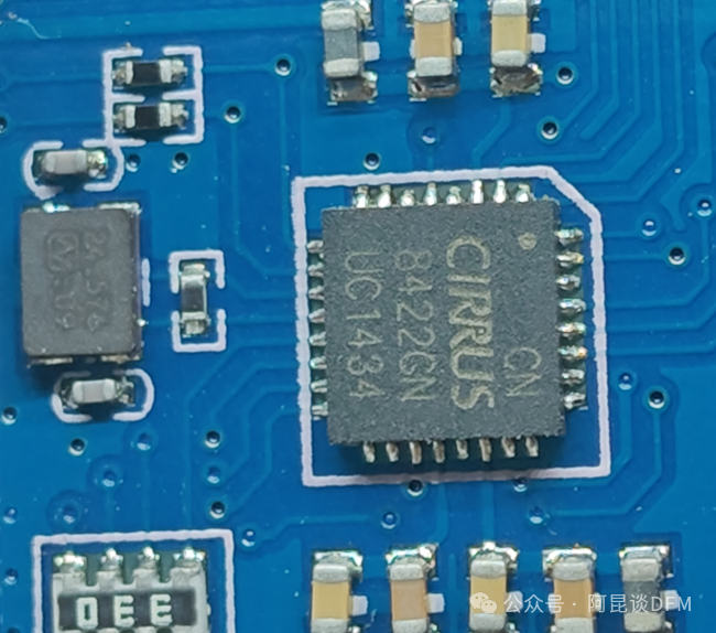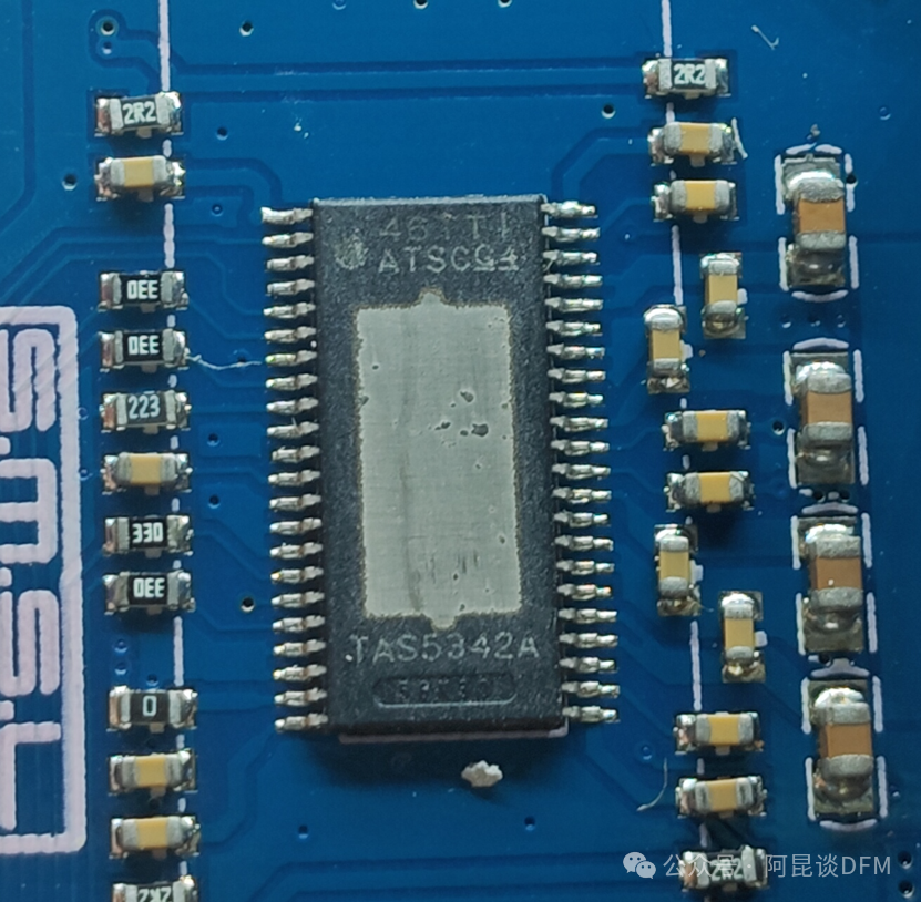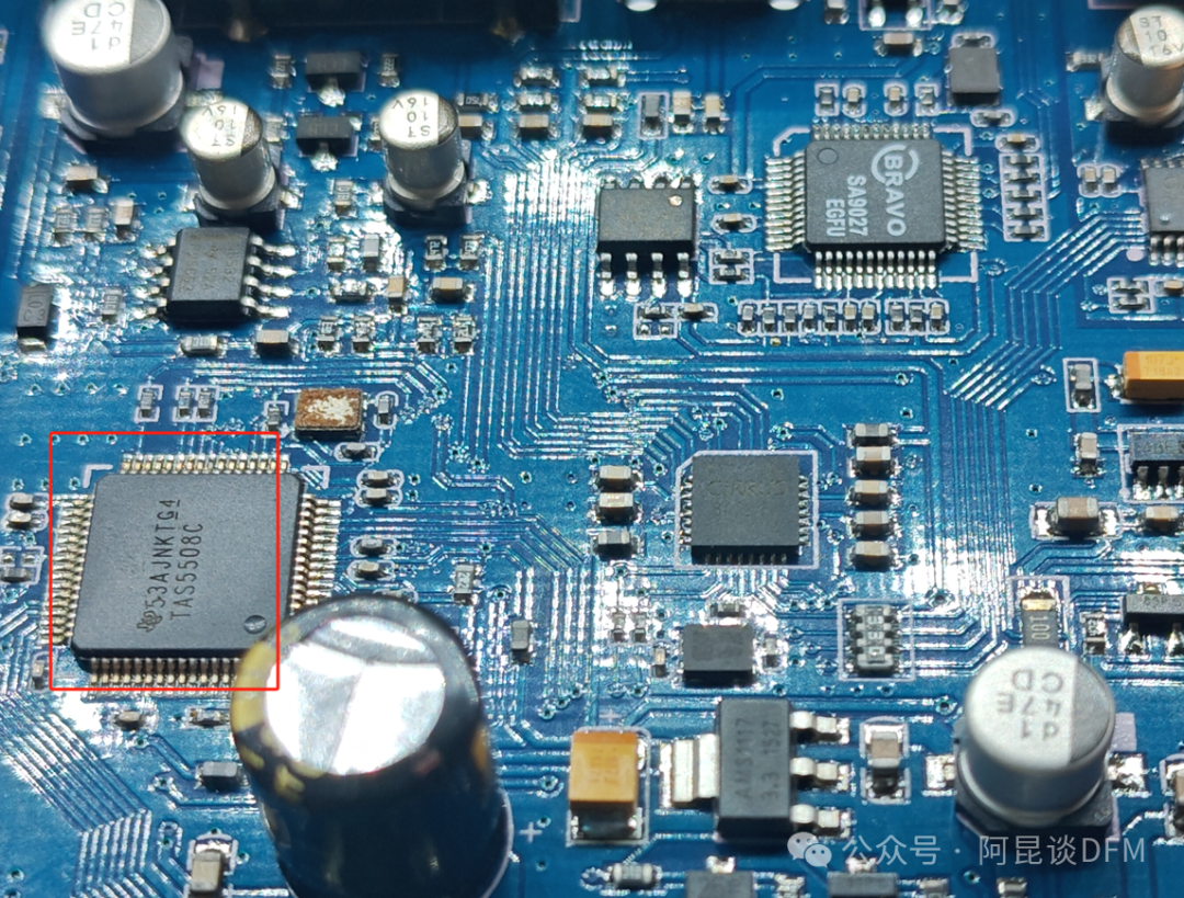边上是一个24.576M晶振,这个3225的晶振我还是第一次见这种外形,平时用的是金属外壳。这个芯片将声音信号处理后,输入到后面要说的TAS5508C芯片