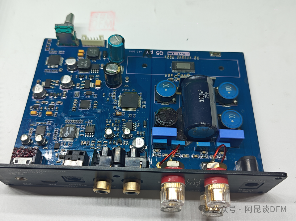 看完前面的功放输出部分,我们再看下音频输入部分,这里面包括了AUX模拟输入、光纤、同轴、USB,各种输入通过一个切换开关选择输入到功放中。