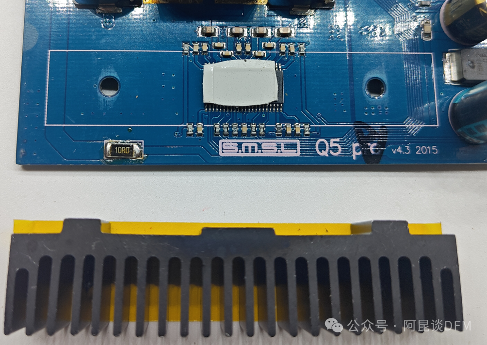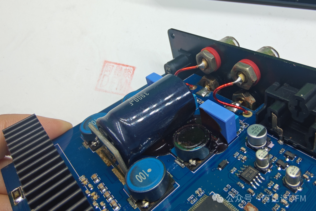 上面就是一个散热片,这个高温胶纸是用来绝缘的,从前面装配上可以看的出来。散热片下面就是数字功放芯片。