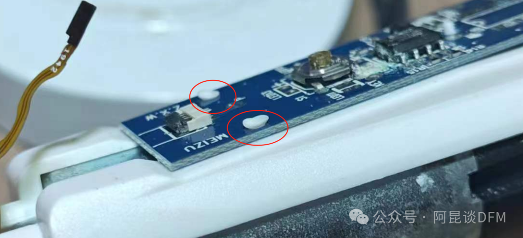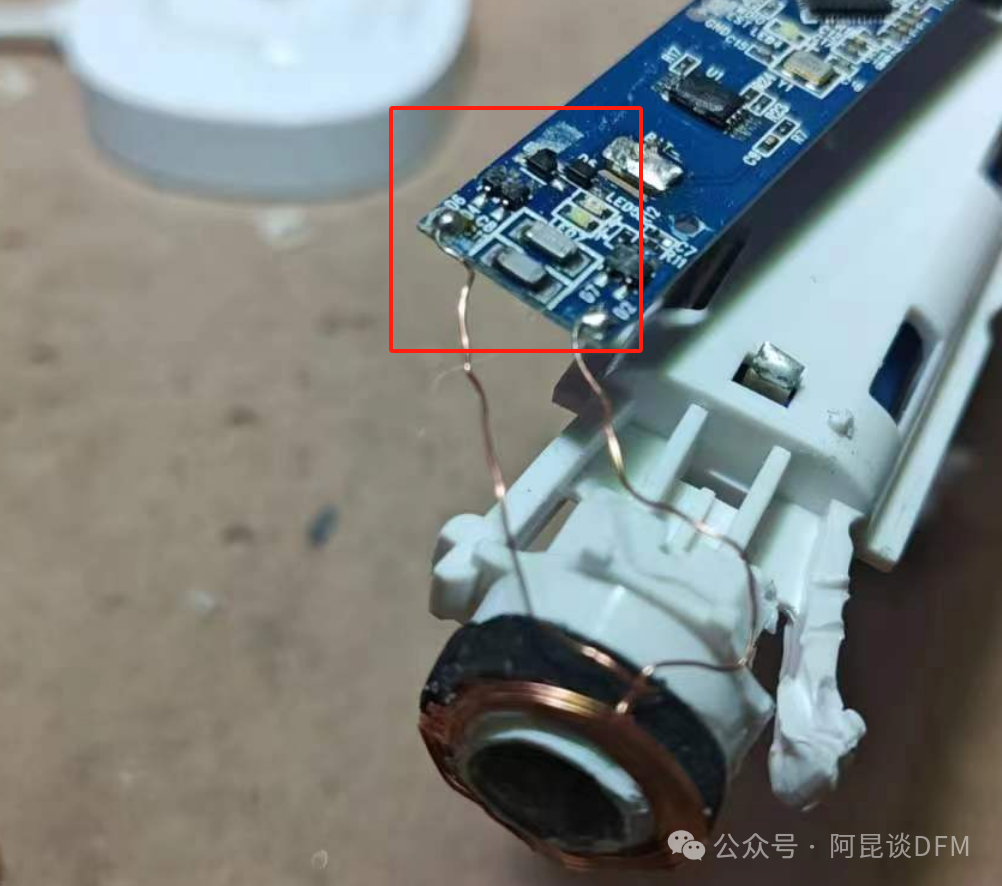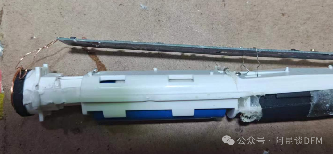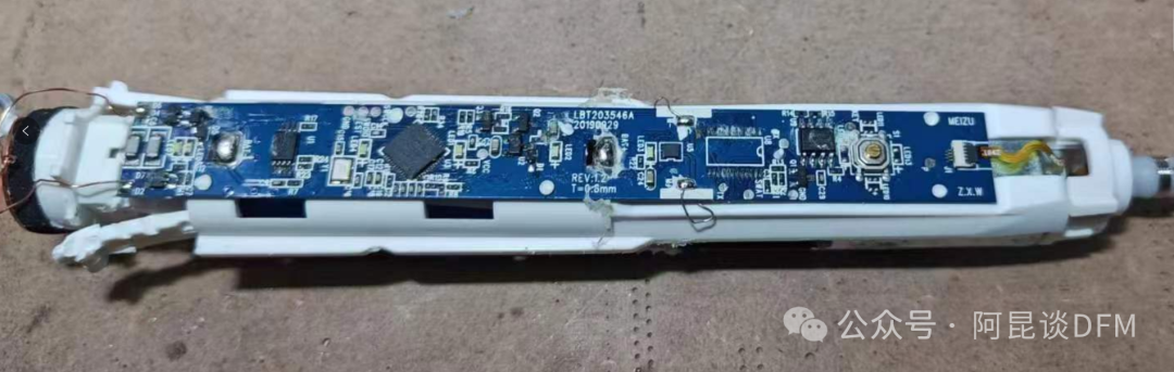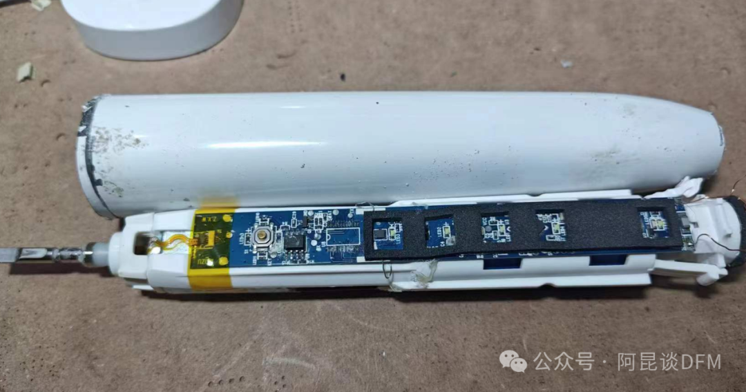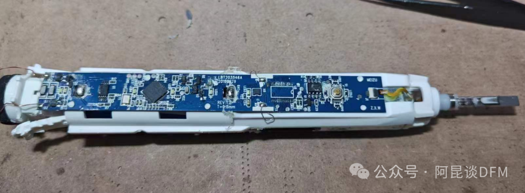 这里通过FPC线连接到了电机振动杆部分,不知道是起的什么作用,知道的麻烦告诉我,我猜是接受牙刷的力度信号用的,因为当刷牙的时候在牙刷上用力时,牙刷头会有相应的振动反馈