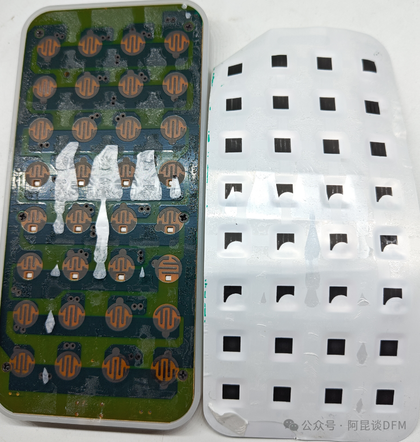 面板是粘上去的,可以直接撕下来,可以看出这个PCB板都对应着一个按键,使用的是碳膜导电,和早期的电视空调遥控器一样。