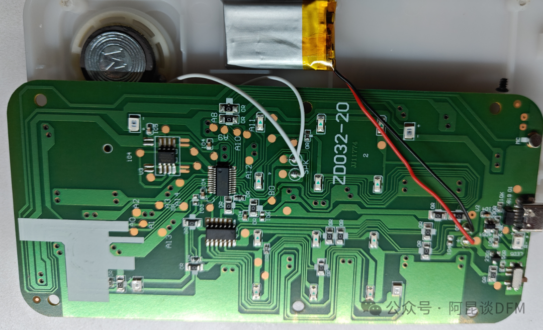 电路板和我想的一样,非常简单,就一个喇叭,还有一个电池,只是没想到这电池挺小,不过够用了。主板就3个芯片。