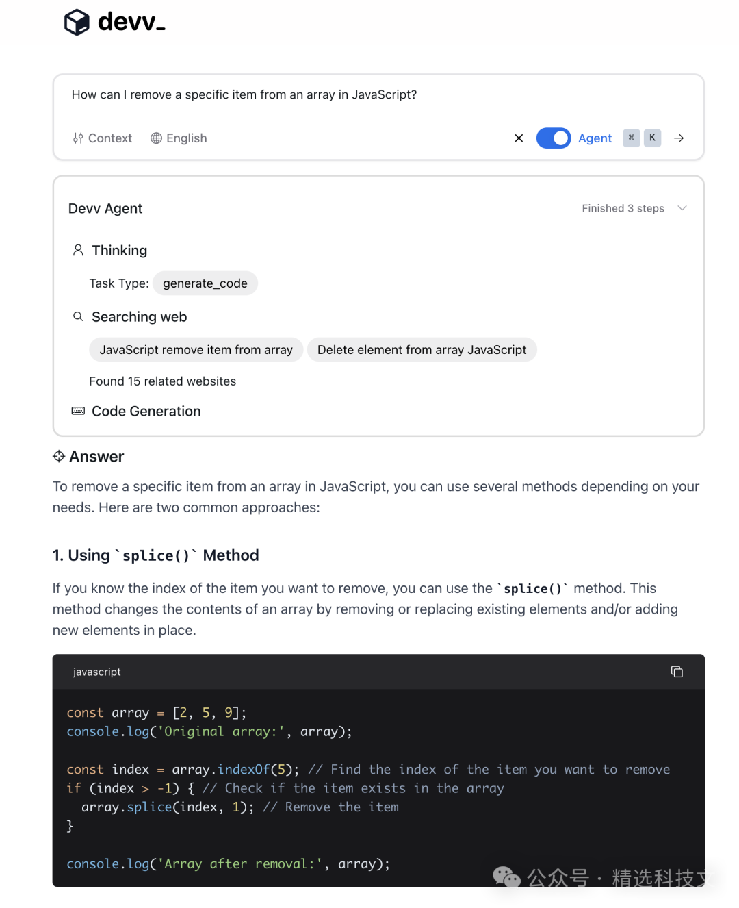 代理模式:针对复杂查询,Devv会推断用户意图,从专门的智能体(如代码生成、解释、调试、优化、网上搜索)中选择合适的方式提供定制化解决方案。