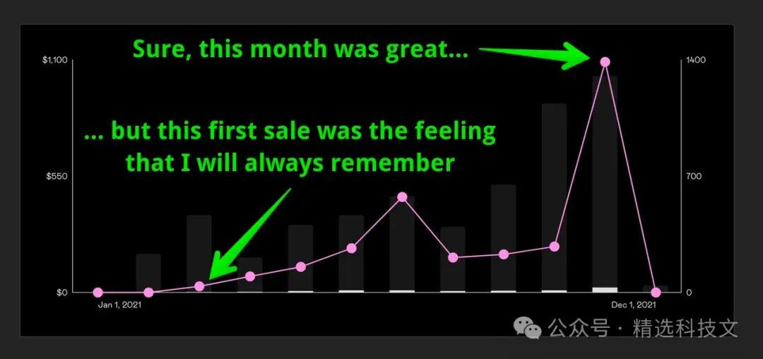 第一次销售比随后的任何一次都更令人兴奋,尽管达到 1000 美元月收入也是一个不错的里程碑。