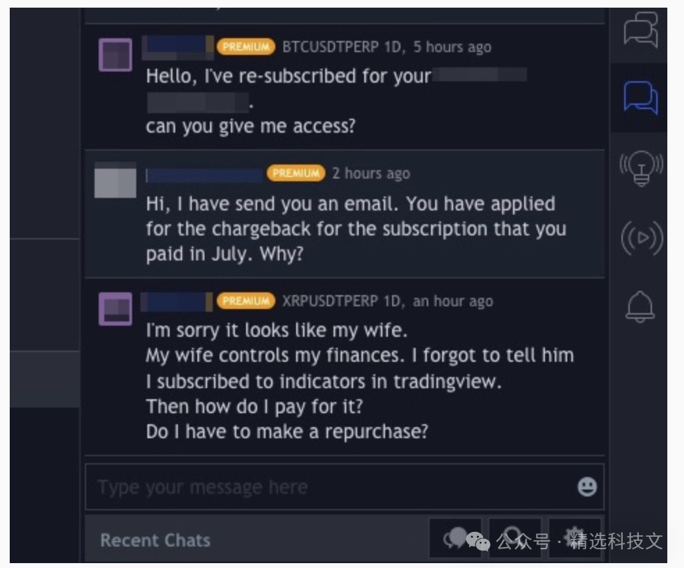 语法错误并不是什么危险信号。我从现有和潜在客户那里收到的电子邮件中经常出现这种情况,所以这并不自动意味着电子邮件是骗局。但是你说你的妻子掌管财务,而你忘了告诉她你买了一个 TradingView 脚本,这导致她发起了纠纷?这比“我是一个买不起 15 美元的学生,但我真的需要这个脚本来进行日内交易”的邮件更奇怪。